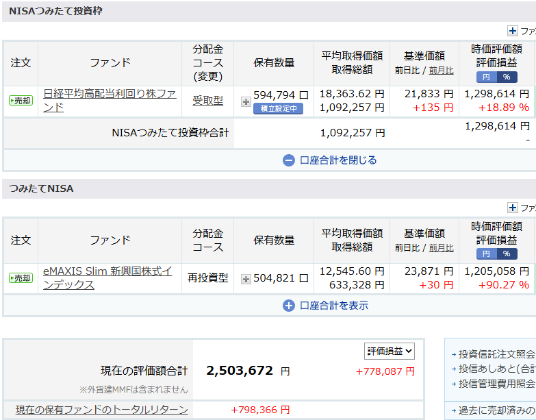日経平均高配当利回り株ファンドをNISAで毎月10万円購入しています。